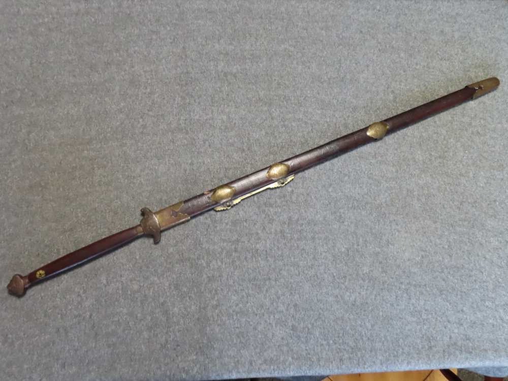 MASSIVE JAPANESE 2 HANDED FIGHTING SWORD WITH INSCRIBED DOUBLE EDGE BLADE THAT IS 37″ LONG AND MEASURES 51″ OVERALL, DETAILED BRASS FITTINGS ON SCABBARD AND GRIP. WOOD SCABBARD HAS CRACK IN THE MIDDLE. BLADE MARKINGS TRANSLATE TO “SPANNING THE UNIVERSE, MONSTERS AND DEMONS LURK EVERYWHERE”. VERY NEAT PIECE FOR YOUR COLLECTION.
