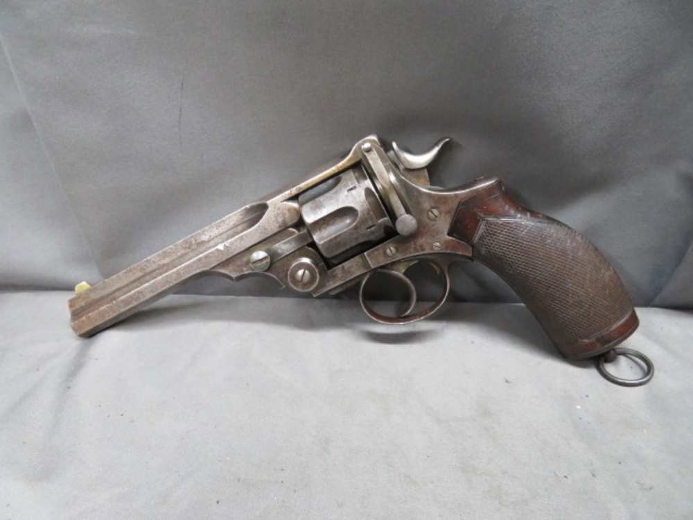 Good condition original antique British Webley Pryse Revolver in .455 caliber that is retailer marked “WILKINSON & SON, PALL MALL, LONDON” on the barrel. Left side of barrel has a six-pointed star marking. No Webley markings on gun. Mechanically functions fine in both single and double actions. Metal finish is original blue, mostly worn to the white, with some gray and brown patina. Bore is good, mostly bright, with strong rifling and a little pitting and oxidation. Wood grip has original finish and checkering with some normal handling marks. Left side of grip is marked with serial number. Original lanyard ring is present. A hard to find Wilkinson Webley Pryse Revolver that will make a fine addition to a collection.