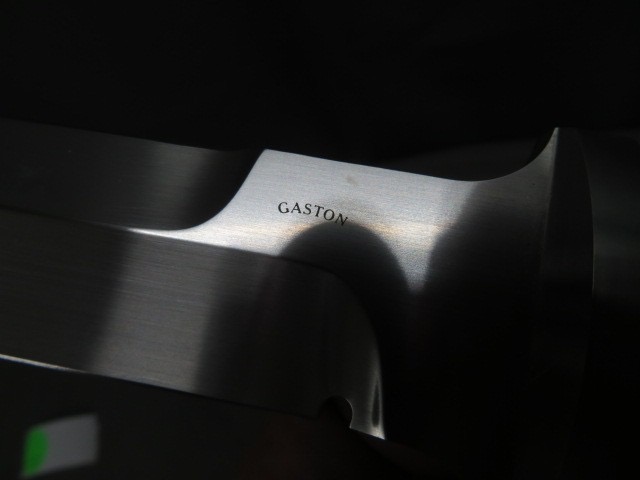 Excellent condition Ron Gaston knife with Mother of Pearl grips. Measures 11 7/8” long overall with a 6 5/8” blade. Blade has beautiful original finish and original sharp edge. Excellent pearl grips with no damage. Fitted in correct original curly grain wooden sheath that is also excellent. Ron Gaston died in 2006. A beautiful, high quality custom knife that will make an outstanding addition to a collection!