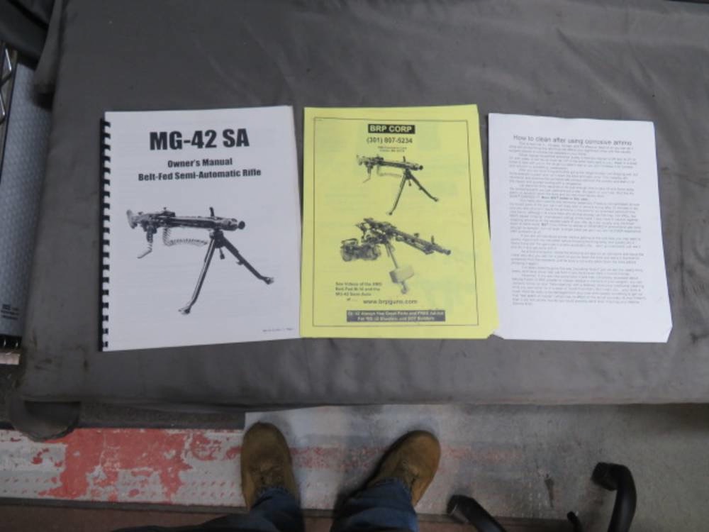Very good condition BRP Guns MG-42 SA semi auto belt fed rifle. Semi auto version of the famous WWII German MG-42 machine gun. Mechanically functions fine. Nice original blue metal finish. Bore is good, dark gray, with strong rifling. Stock has original finish and shows some normal handling marks. Comes with original user manuals. A hard to find semi auto MG-42 that will make a fun shooter and an outstanding addition to a collection!