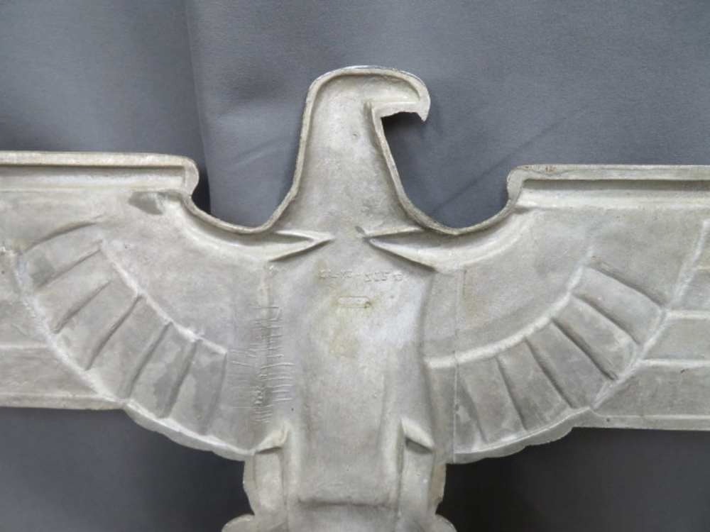 Very good condition original WWII German Reichsbahn (Railway) eagle. Nice detail and attractive patina. Has two drilled, threaded holes. Maker marked on the back and measures about 28 1/8” x 15 ½”. A nice original Reichsbahn eagle that will make a fine addition to a collection and an impressive display!