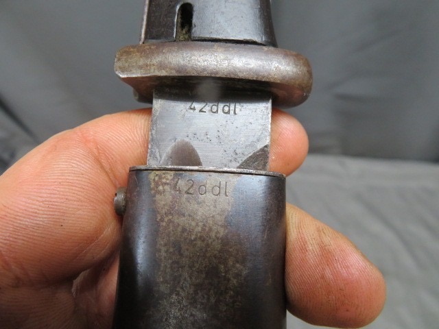 Good condition original WWII German 98k Mauser bayonet that is complete with matching numbered scabbard. Bayonet and scabbard are both marked “42ddl” for manufacture by Josua Corts in 1942. Blade has original blue finish showing some wear and has been sharpened. Hilt has original blue finish turning brown with a little pitting. Bakelite grips have a good tight fit and show some normal handling marks. Lock button functions fine. Matching numbered steel scabbard has mostly brown patina and several dents. A good representative example for your collection.