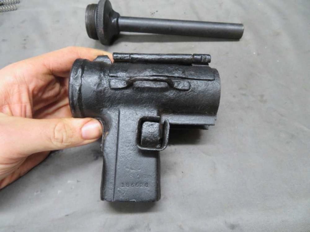 Good condition original WWII US military M3 Grease Gun SMG parts kit. Includes bolt, stock, live barrel, and cut receiver pieces. Metal has been refinished black paint, with some pitting. Bore is good with strong rifling and some oxidation and pitting. Hard to find M3 Grease Gun parts kit!