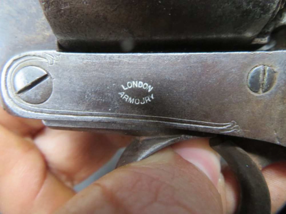 Fair condition original antique Civil War era British Kerr Revolver in .44 percussion caliber that is serial number 1365. Possibly Confederate purchased. Mechanically needs work as the trigger spring is broken, and the cylinder arbor retaining pin and loading lever are missing. Has nice London Armoury manufacturer markings. Metal has mostly brown patina. 5 ¾” barrel has a dark pitted bore. Wood grip shows some burn damage. One grip cap screw is missing. A hard to find revolver in any condition.