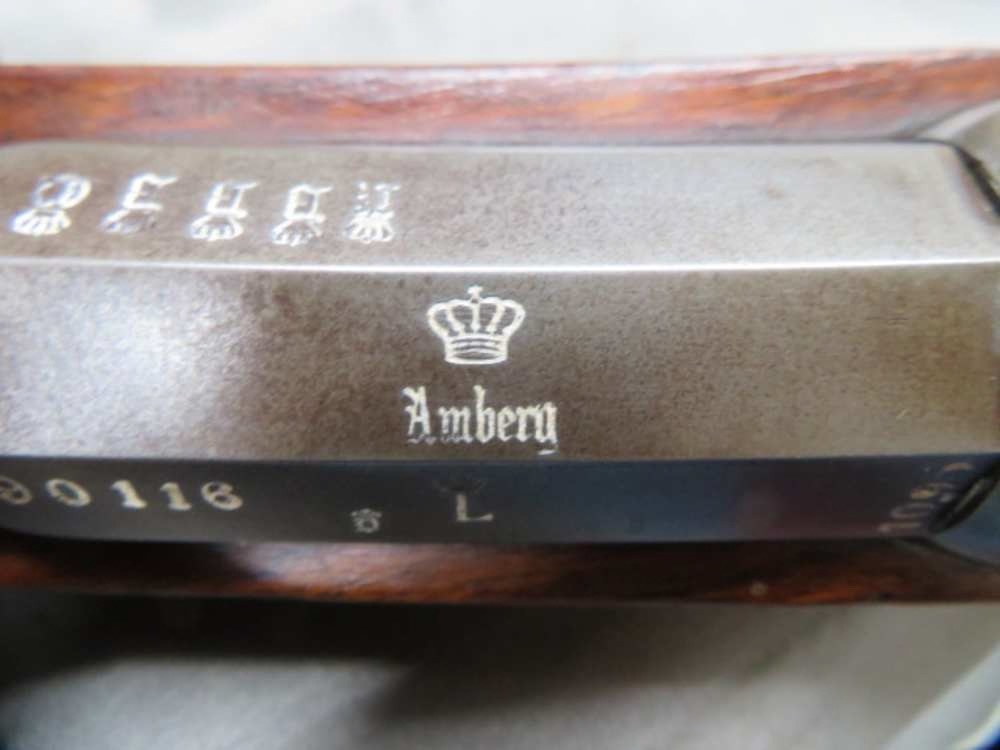Very good condition antique German Model 1871 Mauser Rifle in 11 x 60mm caliber that has Amberg Arsenal markings on the barrel and dated 1881 and 1882 on the receiver. Rifle shows Bavarian use with a “crown L” marking on the barrel, and is unit marked “B.8.R.E.8.199.” on the buttplate tang for the 8th Royal Bavarian Infantry “Grand Duke Frederick II of Baden”, Company 8, Weapon 199. Rifle is NOT import marked and has all matching serial numbers except the buttplate and triggerguard sling swivel screw. Barrel has original blue finish mostly worn to the white, with some gray and brown patina. Remaining metal finish is original “in the white” with some gray and brown patina. Bore is bright and excellent with strong rifling. Stock has original finish and shows some normal handling marks. Right side buttstock and underside of buttstock have Imperial German proof mark cartouches. Complete with correct original cleaning rod. A hard to find Bavarian issued M71 Mauser Rifle that will make a fine addition to a collection.