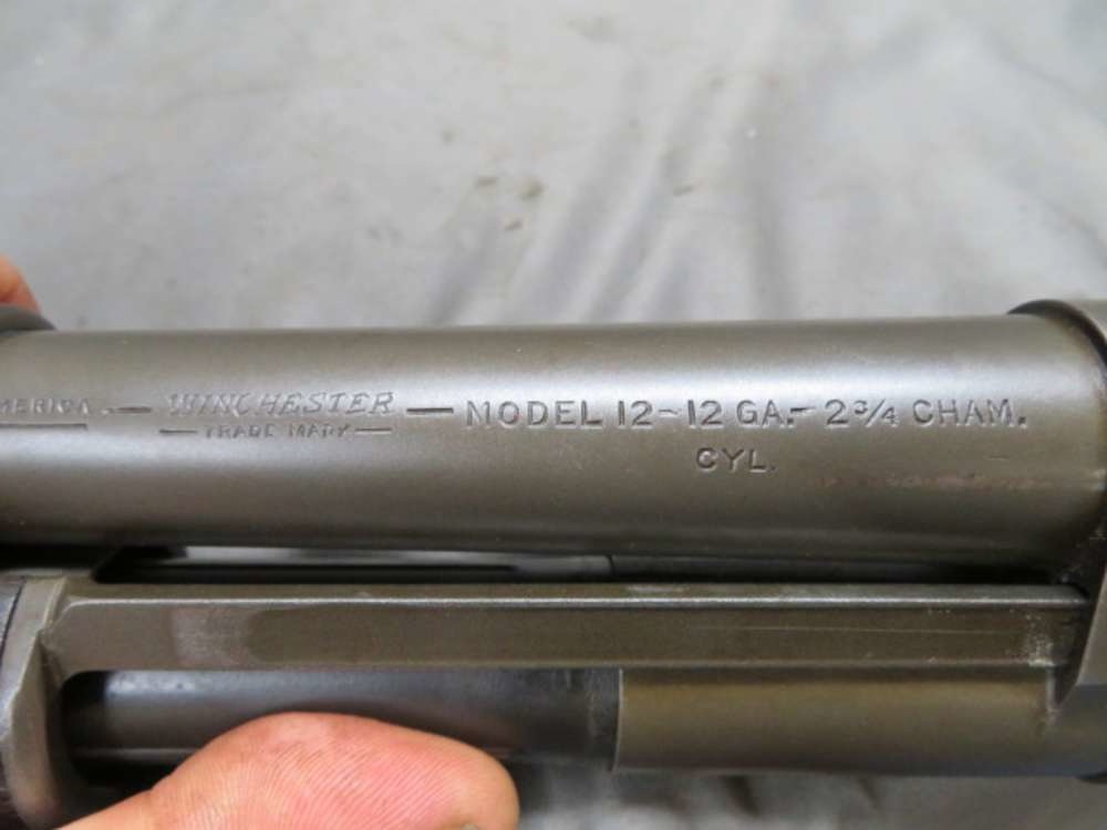 Very good condition WWII US military Winchester Model 12 trench gun pump action shotgun. Mechanically functions fine. Serial number 960xxx, which is in the correct range. Note that the serial numbers on the receiver and barrel assembly were hand-stamped, NOT machine done. Right side of receiver has original “U.S.” and “flaming bomb” markings. Barrel is dated “42” and has a flaming bomb marking on top. 20” barrel appears to have had a sight bead, as a riot gun would have, and this was removed and the hole plugged. Fitted with an original, but incorrect earlier 6-row handguard. The magazine tube has been modified from takedown pin to screw. Metal finish is arsenal refinished gray parkerized. Bore is very good and bright. Forend has original finish. Buttstock is marked “OSP” in the right side buttstock and “66” and “IE” in the left side buttstock and shows some normal handling marks. Does NOT have US military markings and has a “BISHOP” buttplate. This gun was likely reworked after WWII and later issued to a police force, likely Ohio or Oregon State Police. An interesting Winchester Model 12 trench gun for your collection.
