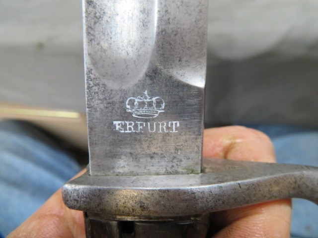 Very good condition original WWI Imperial German 98/05 Mauser butcher bayonet that has Erfurt Arsenal markings on the right ricasso and dated 1915 on the spine. Blade has original bright finish with a little graying. Hilt has original bright finish with some graying. Wood grips have original finish and show some normal handling marks, lock button functions fine. Fitted in correct original steel scabbard that has plum brown patina and no dents. Also complete with original frog and knot. Leather frog is maker marked and dated 1916. Leather is pliable with some wear, stitching shows some loss. Troddel (knot) has colors for Company 2 of an Infantry Regiment and shows some wear and staining.