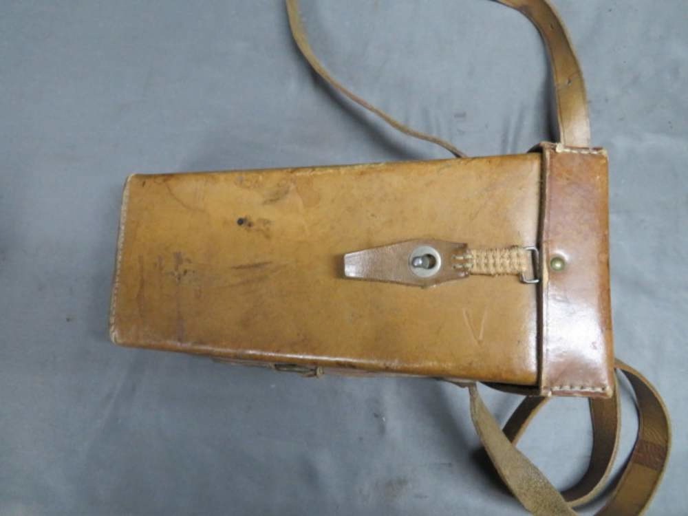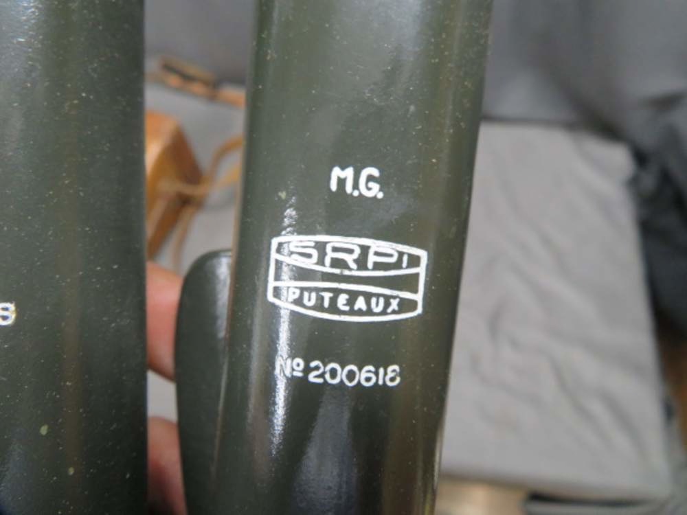 Very good condition original WWII era French military 8 x 24 “rabbit ears” trench periscope. Nice original green paint and clear optics. Nice markings including “M.G.” for Ministère de la Guerre and “SRPI” for Société de Recherches et de Perfectionnements Industriels . Complete with original leather case that is supple with light wear. Stitching shows a little loss. Case is complete. Nice piece for your collection.