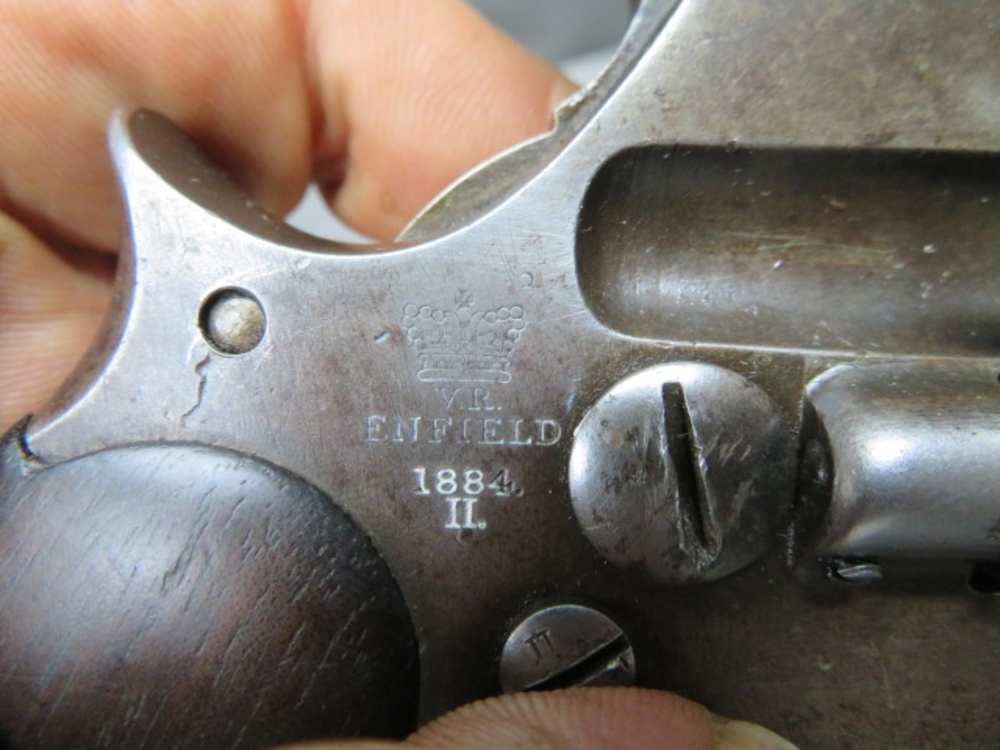 Good condition original antique British Mark II Enfield Revolver in .476 caliber that was manufactured by Enfield in 1884, as marked on the right side of the frame. Mechanically functions fine. Original blue finish is largely worn to the white, with some gray and brown patina. Bore is good, bright with good rifling and some light pitting. Front sight is missing. Wood grip has original finish and shows some normal wear and handling marks. A hard to find British Mark II Enfield Revolver in any condition. Relisted due to nonpaying bidder.