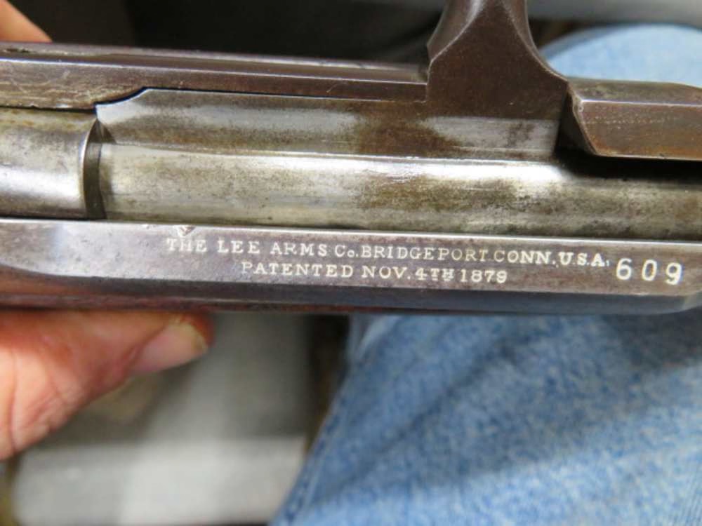 Good condition antique Remington Lee Model 1879 bolt action military rifle in .45-70 Government caliber. Mechanically functions fine and complete with original magazine. Metal has mostly brown patina. Bore is very good and bright with strong rifling. Stock forend is a spliced replacement ahead of the rear band. Both sides of wrist have a crack. Remaining wood has original finish and shows some normal handling marks. Complete with cleaning rod. A hard to find Remington Lee Model 1879 Military Rifle, with only 1,000 produced.