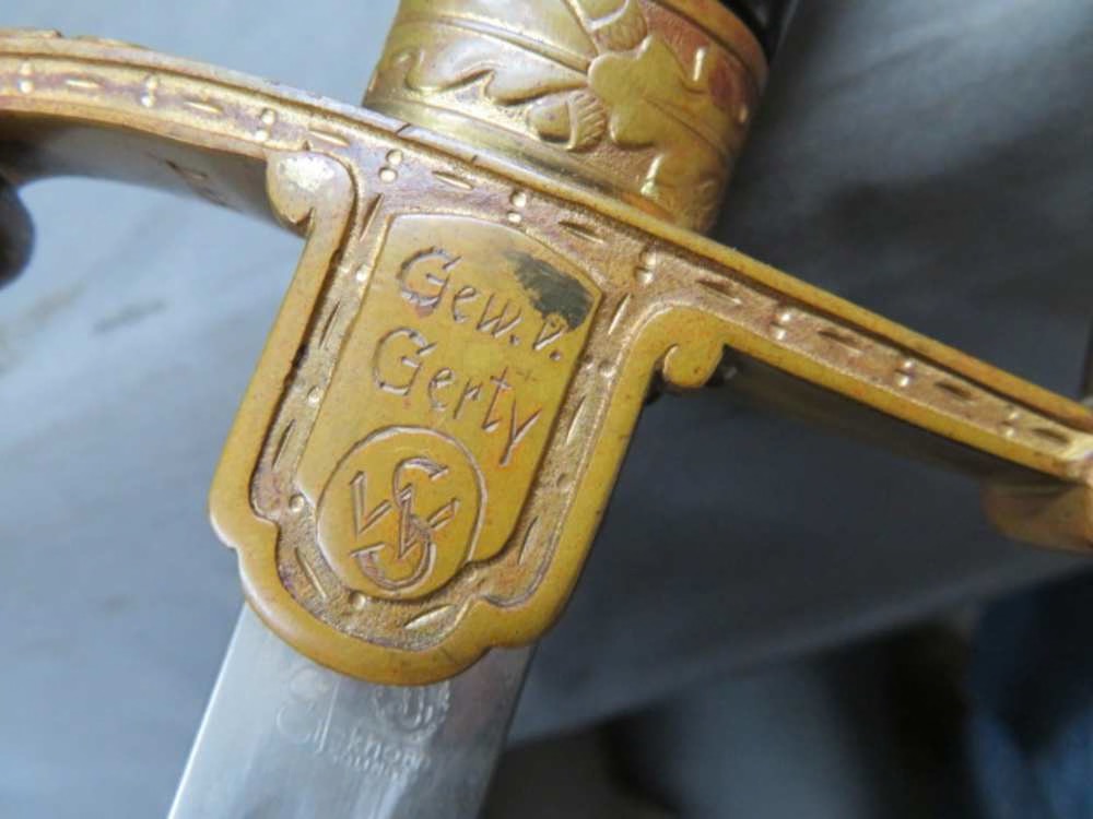 Very good condition original WWII German army officer dress sword that has the Carl Eickhorn “squirrel” trademark on the left ricasso and is a textbook Model Nr. 1706 “Scharnhorst” from the Field Marshall series. 35” blade has nice original bright finish and was never sharpened. Still has original leather washer at the base. Brass hilt has nice looking patina Right side of guard has eagle and swastika. Lion head pommel has nice red glass eyes. Grip has tight wire wrap and no damage. Fitted in correct original steel scabbard that has original black paint showing a little flaking and several dents. A nice WWII German Heer officer sword!