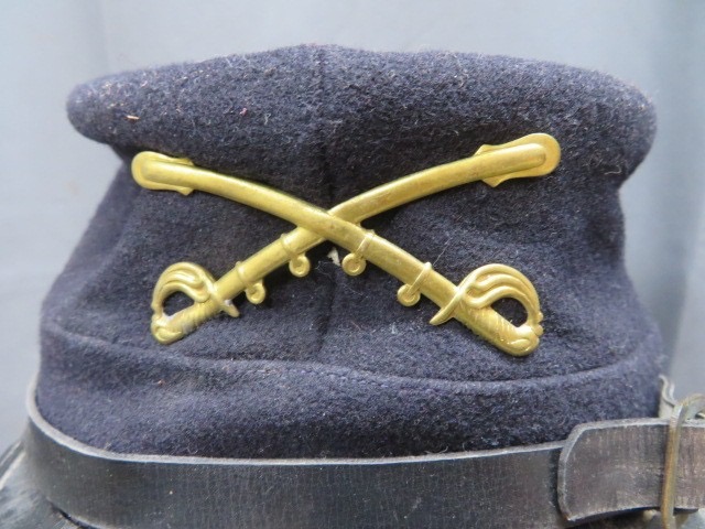 Very good condition original Indian Wars US Army Model 1872 kepi hat. Shows some normal wear. Nice original cavalry insignia on the front. Complete with original chinstrap and buttons. Visor has tight stitching. Leather sweatband is soft and supple with some normal wear and has tight stitching. A nice, classic Indian Wars kepi for your collection.