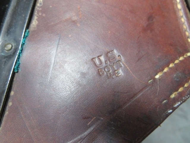 Very good condition original WWII US military M1 Garand rifle vehicle scabbard. Leather is soft and supple with attractive color and shows some normal wear. Maker marked “BOYT” and dated “-42-“ for 1942. Stitching and rivets are tight. Scabbard is complete. Nice accessory for your M1 Garand.