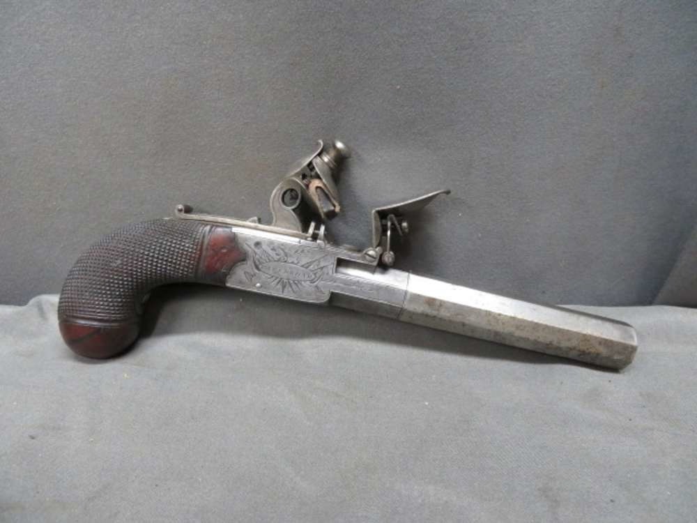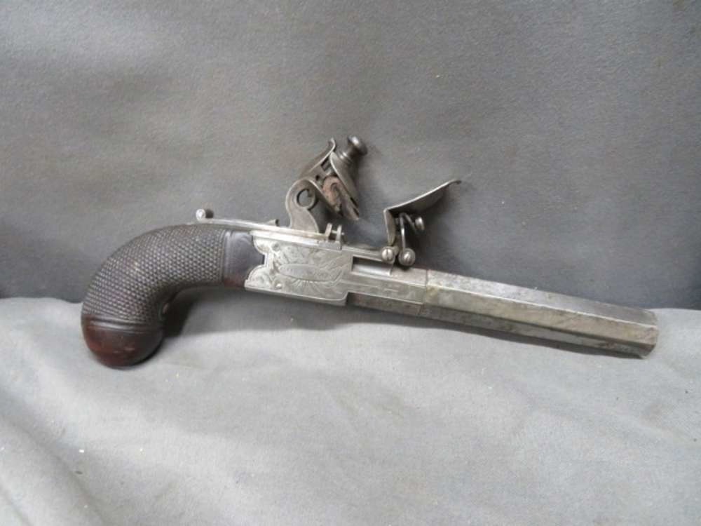 Very good condition original antique pair of cased English .54 caliber flintlock pocket pistols. Both are marked “JOHN CROWN” and “FAVERSHAM” and mechanically function fine, featuring folding triggers. Metal finish is original “in the white” with some gray and brown patina. 3 3/8” octagonal barrels have very good bright bores with strong rifling. Wood grips have original finish and checkering and a good tight fit with some normal handling marks. Pistols come with original green felt lined wooden case that has a seal in the lid for the Vatican City / Papal States under Pope Pius IX (1846-1878). Case is in very good condition. Wood has original finish and shows some normal handling marks. An interesting pair of flintlock pistols that will make an excellent addition to a collection!