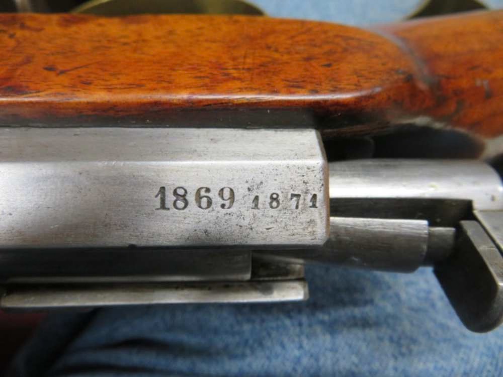 Fine condition antique German Wurttemberg Model 1868 Dreyse needle gun rifle in 15.4mm caliber that has Oberndorf manufacturer and model designation markings on the left rear of receiver and dated 1869 and 1871 on the right rear of receiver. Rifle is NOT import marked and has all matching serial numbers. Mechanically functions fine and has intact needle. Receiver, bolt, and buttplate are original “in the white” with some graying on the buttplate. Remaining metal finish is nice original blue showing a little normal wear. Nice brass fittings. Bore is bright and excellent with strong rifling. Stock has original finish and shows some normal handling marks. Left side of stock has a crack above the triggerguard. Right side buttstock and underside of buttstock have nice German proof mark cartouches. Rifle is unit marked “119.R.2.1.” on the buttplate tang for the 119th (1st Württemberg) Grenadiers “Queen Olga”, Company 2, Weapon 1. Complete with correct original clearing rod. A rare Dreyse needle gun variation that will make an excellent addition to a collection!