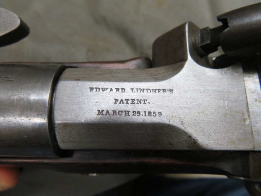 Very good condition original antique Civil War US Army Lindner Cavalry Carbine in .58 percussion caliber that is a first type example. Only 892 of this model were produced, and were issued to 1st Michigan Cavalry and 8th West Virginia Mounted Infantry. Mechanically functions fine. Metal finish is original bright with some gray and brown patina. Bore is very good and bright with strong rifling and a little pitting. Stock has original finish and shows some normal handling marks. A rare Civil War Lindner Carbine that will make a fine advanced addition to a collection.