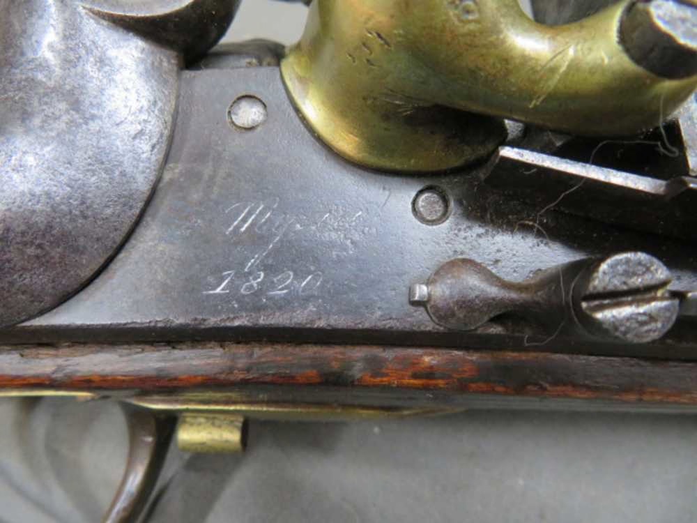 Good condition original antique Imperial Russian Model 1828 flintlock musket in .75 caliber. Made using an early, 1820-dated lock. Mechanically functions fine. Metal has mottled brown and gray patina with some pitting. 41 ½” barrel has a dark pitted smooth bore. Stock has original finish and shows some normal handling marks. Brass buttplate has an Imperial Russian eagle marking on the tang. A good example of a rare Russian military musket.