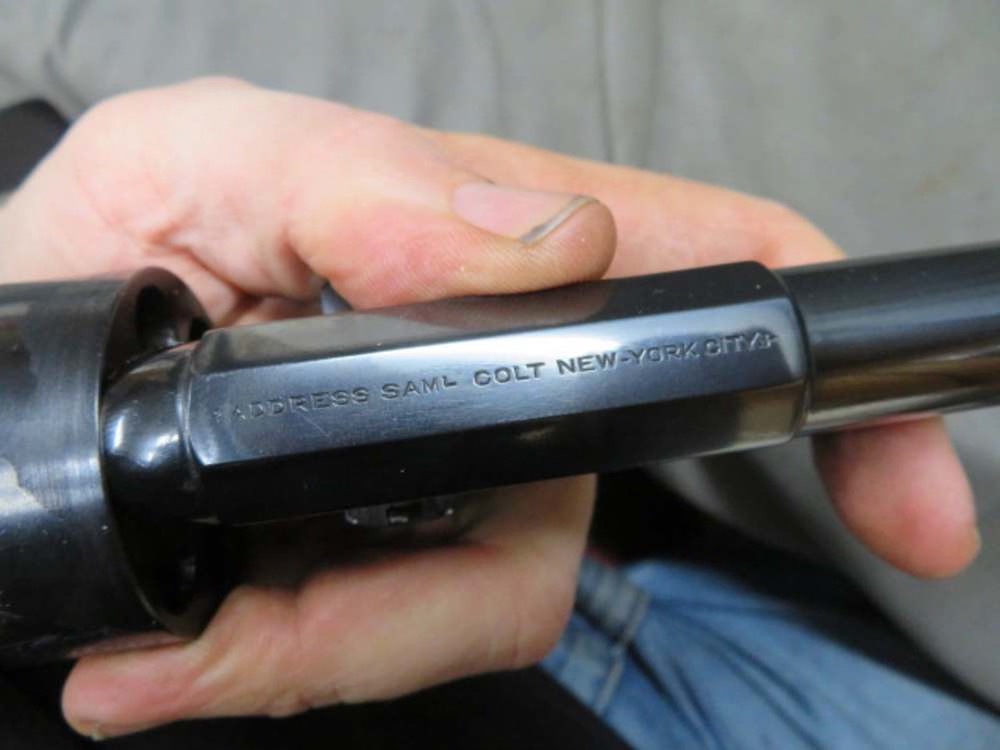 Excellent condition Colt Signature Series reproduction 1st Model Dragoon Revolver in .44 percussion caliber. Mechanically functions fine and tight. Excellent blued and case colored finish. Silver finished grip strap and triggerguard have some tarnish. 7 ½” barrel has a bright excellent bore with strong rifling. Excellent wood grip with original finish. Complete with correct original box. A high quality reproduction Colt Dragoon Revolver.