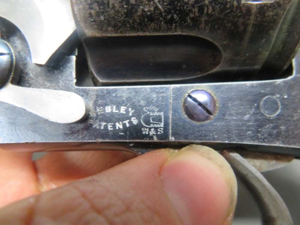 Very good condition antique British Webley “WG” Model Revolver in .455 caliber. Mechanically functions fine in both single and double actions. Left side of frame has Webley manufacturer markings. Gun is marked “ARMY & NAVY C.S.L.” on the barrel for Army & Navy Cooperative Society Limited, which sold guns to military personnel. Gun is NOT import marked and has all matching numbers. Metal finish is nice original blue showing some normal wear. 6” barrel has a bright excellent bore with strong rifling. Checkered hard rubber grips have a good tight fit and show some normal handling marks. Right side grip has a chip at the top. Original lanyard ring is present. A nice looking antique Webley revolver that will make a fine addition to your collection!