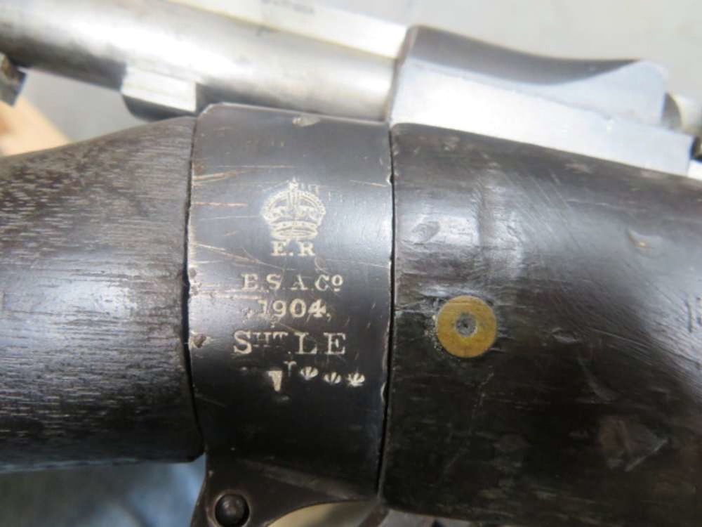 Good condition WWI British No. I MK I*** SMLE Enfield Rifle in .303 British caliber that was manufactured by L.S.A.Co. (London Small Arms Company) in 1904, as marked on the right side of the receiver socket. Rifle shows Irish use, with the “ER” prefix serial number on the receiver. Rifle is NOT import marked and has matching Irish serial numbers on the receiver and bolt, and original matching numbers on the receiver, barrel, and rear sight. Forend does not match, and nosecap is unnumbered. Rifle has the distinctive bolt head charger guide and is complete with original volley sights and magazine cutoff. Metal finish is original blue showing some normal wear. Bore is good with strong rifling and a little pitting. Stock has original finish and shows some wear and handling marks. Left side of front handguard has a large chip. Right side buttstock has original brass unit marking disc that is stamped “HSD R E 8038”, for an unidentified Royal Engineers unit. A good example of a hard to find British No. I MK I*** SMLE Enfield Rifle.