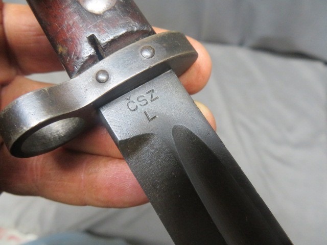 Very good condition original WWII Romanian contract Czech VZ 24 Mauser bayonet that is marked “CSZ/L” on the left ricasso and has the Romanian “CM” marking on the bottom of the tang. Blade has nice arsenal reblue finish. Hilt has arsenal reblue finish showing some wear. Wood grips have original finish and a good tight fit with some normal handling marks, lock button functions fine. Fitted in correct original steel scabbard that has nice arsenal reblued finish and no dents. A good example for your collection.