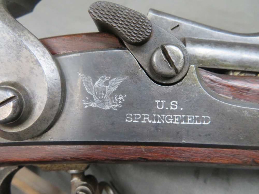 Very good condition original antique US Model 1865 (1st Allin Conversion) Trapdoor Springfield Rifle in .58 rimfire caliber. Only 5,000 of these were produced by converting Civil War Model 1863 Springfield Rifled Muskets to metallic cartridge breechloaders. Lock is marked “U.S. / SPRINGFIELD” with the American eagle and dated 1865. Mechanically functions fine. Metal finish is original “in the white” with some scattered gray and brown patina. Bore is good with strong rifling and some pitting. Stock has original finish and shows some normal handling marks, wrist has a repaired crack. Left side of stock has light inspector cartouches in the flat opposite the lock. Complete with correct original ramrod. A nice example of a rare 1st Allin Conversion Trapdoor Springfield Rifle.