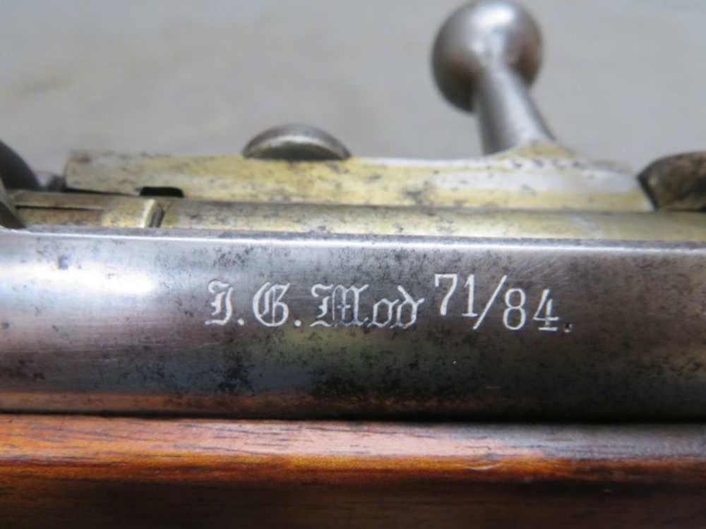 Fine condition antique German 71/84 Mauser Rifle in 11mm Mauser caliber that has Spandau Arsenal markings on the barrel and dated 1887 on the receiver. Rifle is NOT import marked and has all matching serial numbers. Mechanically functions fine including working magazine cutoff. Receiver, bolt, and buttplate is original “in the white” with some gray and brown patina. Remaining metal finish is nice original blue showing a little normal wear. Bore is very good and bright with strong rifling and a few pits. Stock has original finish and shows some normal handling marks. Right side buttstock and underside of buttstock have sharp clear Imperial German proof mark cartouches. Rifle is unit marked “24.R.R.442.” on the buttplate tang for the Recruiting Depot of the 24th (4th Brandenburg) Infantry “Grand Duke Frederick Francis II of Mecklenburg-Schwerin”, Weapon 442. A nice looking German 71/84 Mauser rifle with matching numbers.